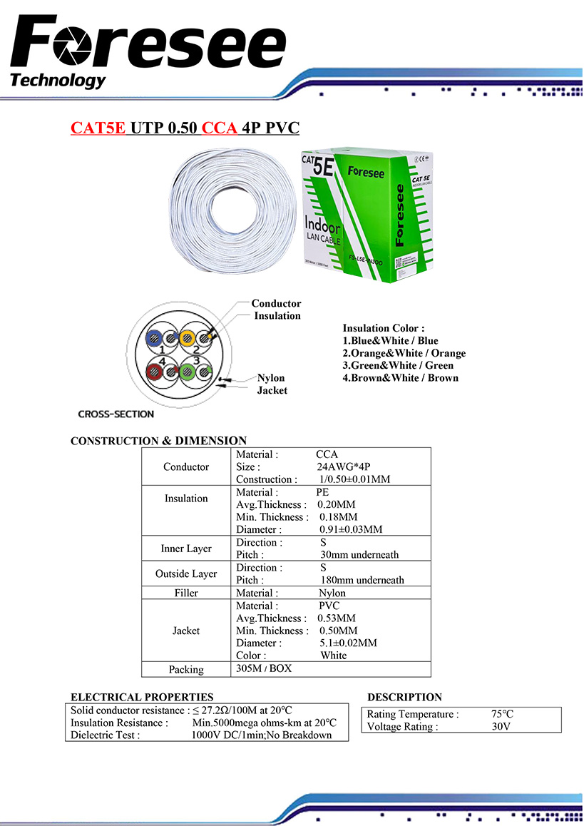 สายสัญญาณ Foresee Cat5E Indoor 305M รุ่น FS- CCA5E-8305 เสปค CCA ทองแดง 30% ทนความร้อน 75 องศา