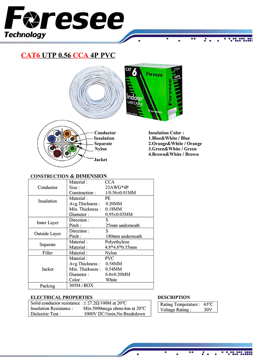 สายสัญญาณ Foresee CAT6 Indoor 305 M รุ่น FSCCA6-8305 เสปค CCA ทองแดง 30% ทนความร้อน 65 องศา